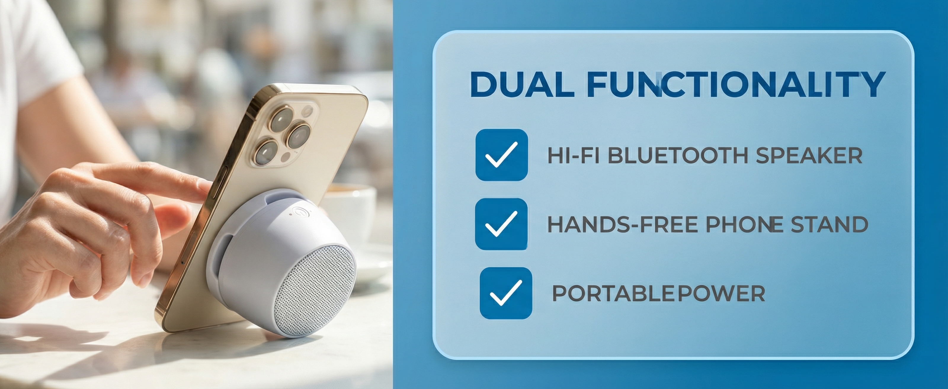 ✔ Discover the ultimate 2-in-1 promotional tech gift: Magnetic Ring Mini Speaker & Stand. Crafted from sleek ABS plastic, this compact device transforms from a high-quality Bluetooth speaker into a stable phone stand in seconds—simply attach your phone via the built-in magnetic ring.