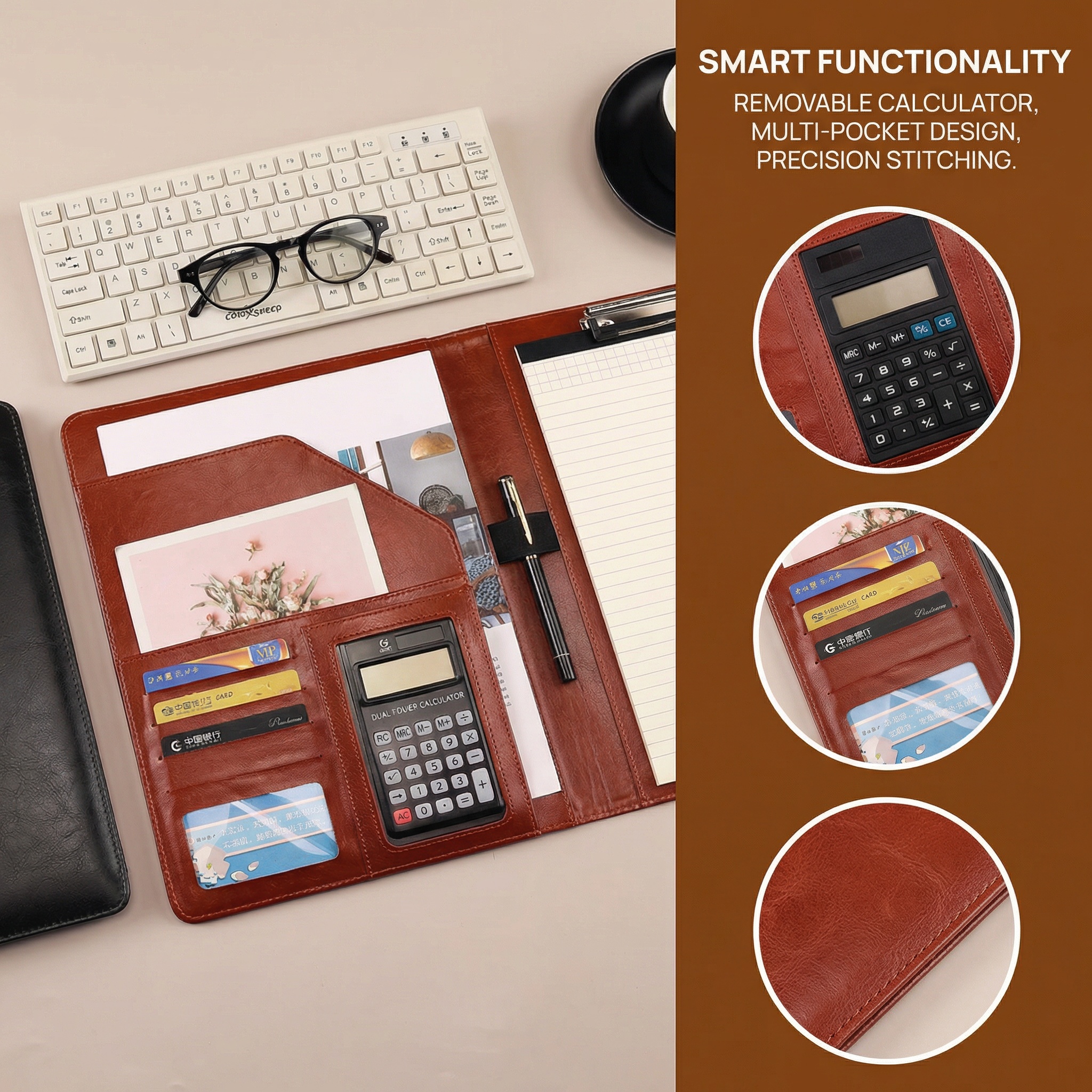 ✔ Designed for busy professionals, students, and office workers, this folder offers smart storage with slots for business cards, documents, notes, and a removable calculator.